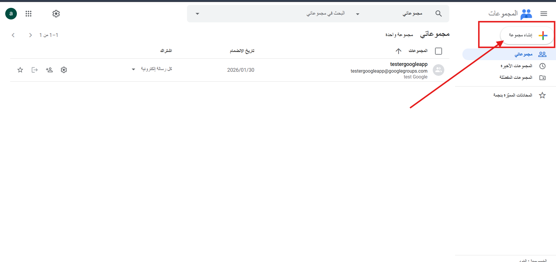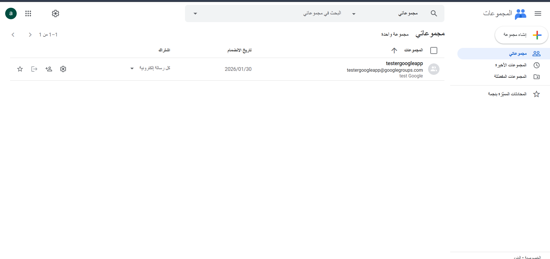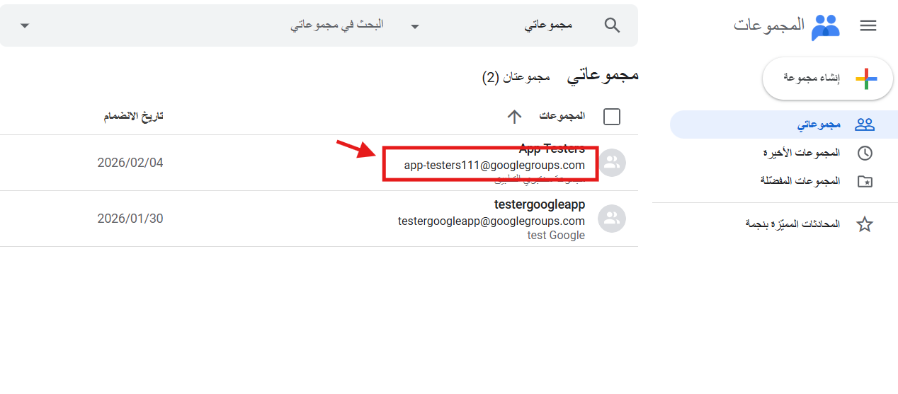 Group email: هيتولد تلقائيًا (مثال: apptest@googlegroups.com)