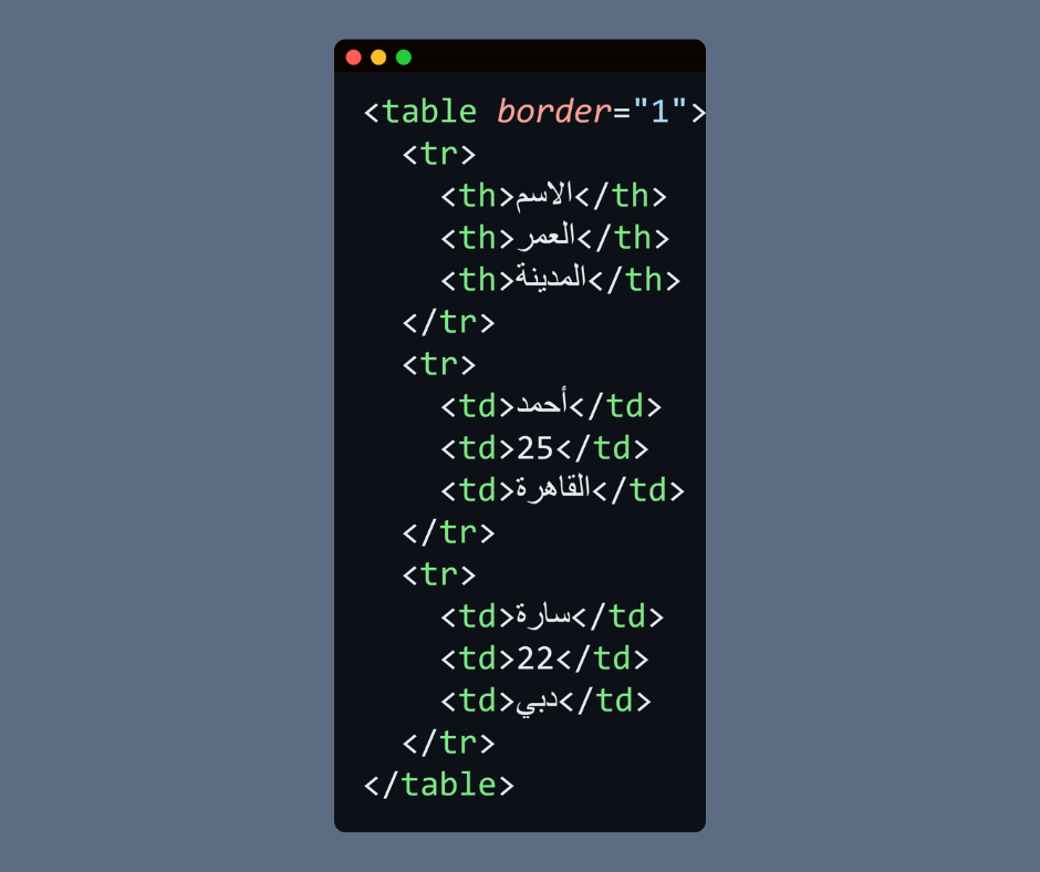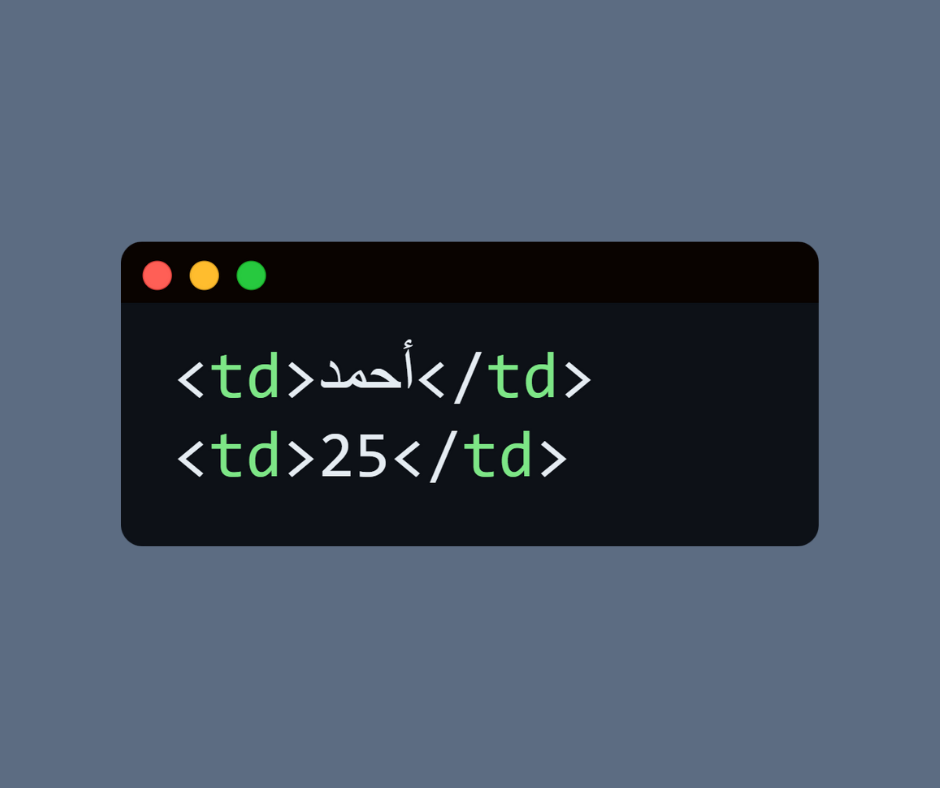 • كل صف يحتوي على خلايا بيانات <td> أو خلايا عناوين <th>.