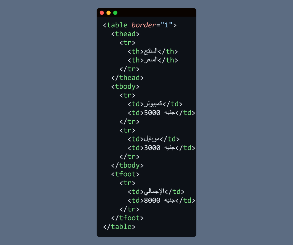 • <tfoot> → تذييل الجدول (زي المجموع أو ملحوظات).