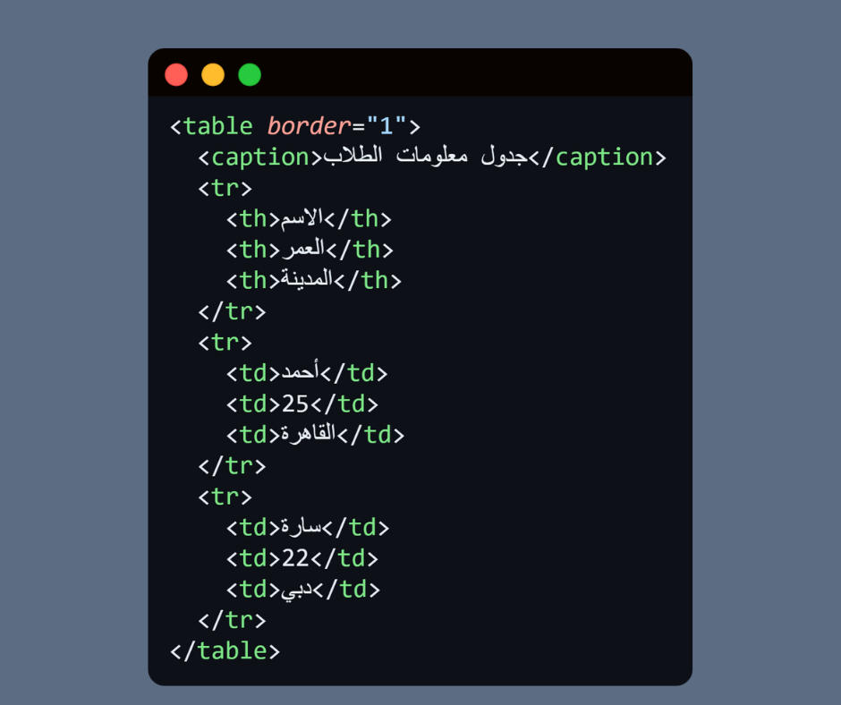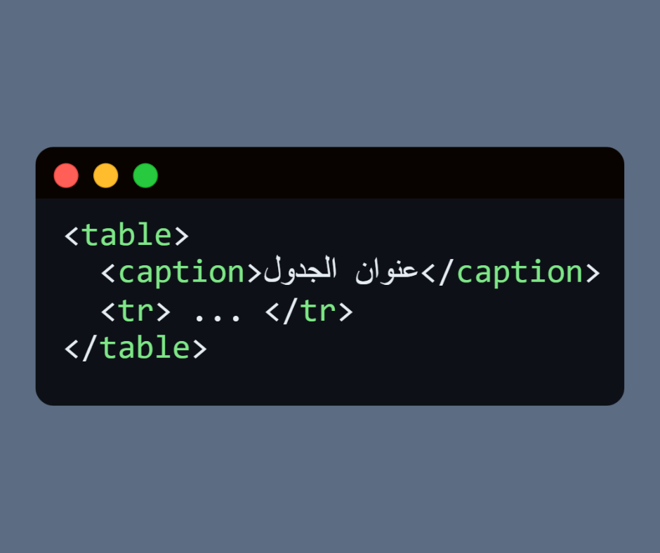 <caption> يُستخدم لإضافة عنوان وصفي للجدول.