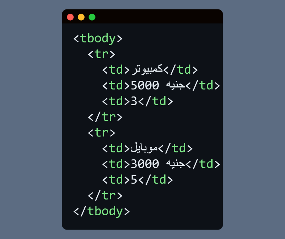 <tbody> → جسم الجدول (البيانات الأساسية).
