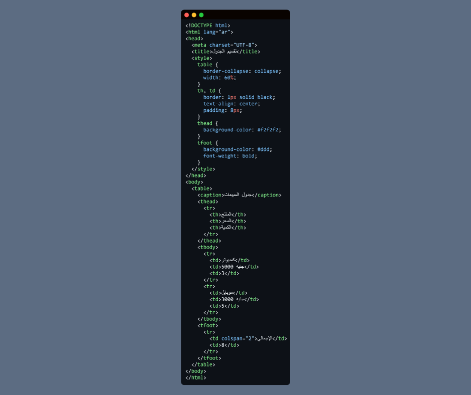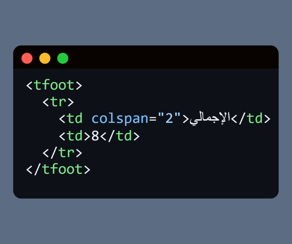 التذييل <tfoot> فيه “الإجمالي” بخلفية مختلفة.
