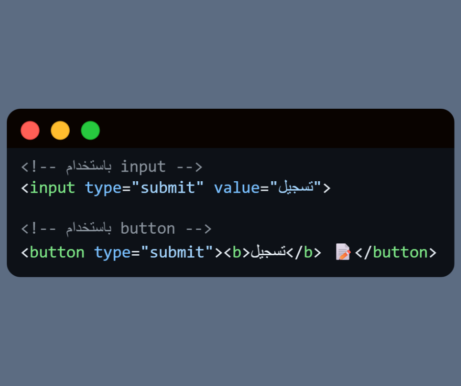 <button type=”submit”> = أكثر مرونة (ممكن نضيف أي محتوى داخله).