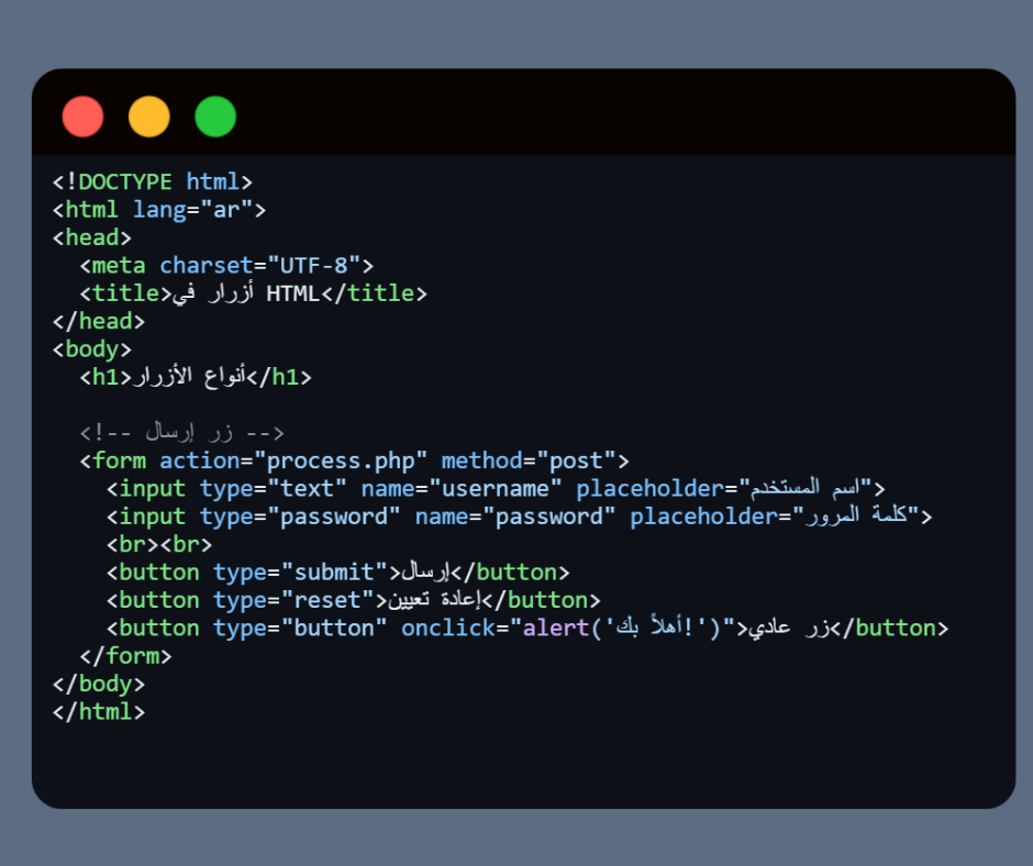 type=”button” → زر عادي يُستخدم مع JavaScript.