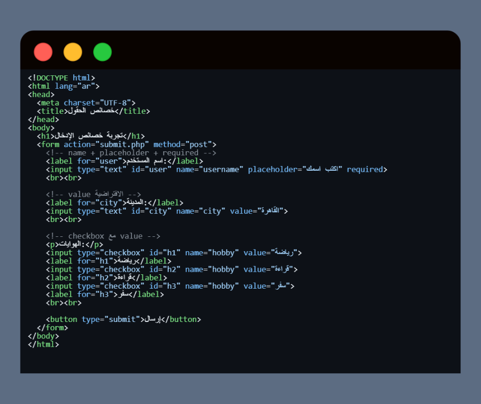 • placeholder → نص إرشادي داخل الحقل (ما بيتبعتش).